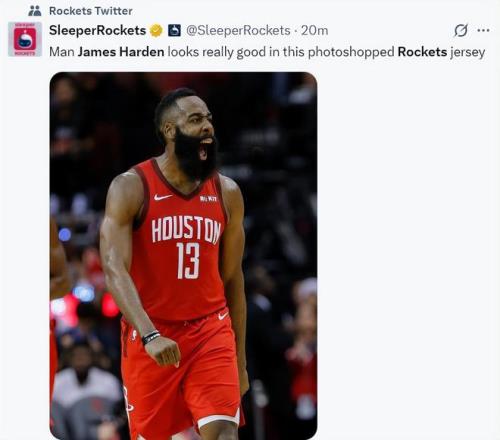 休媒SR寫道:這張哈登“PS”的火箭球衣照片看起來他的狀態(tài)非常之好。